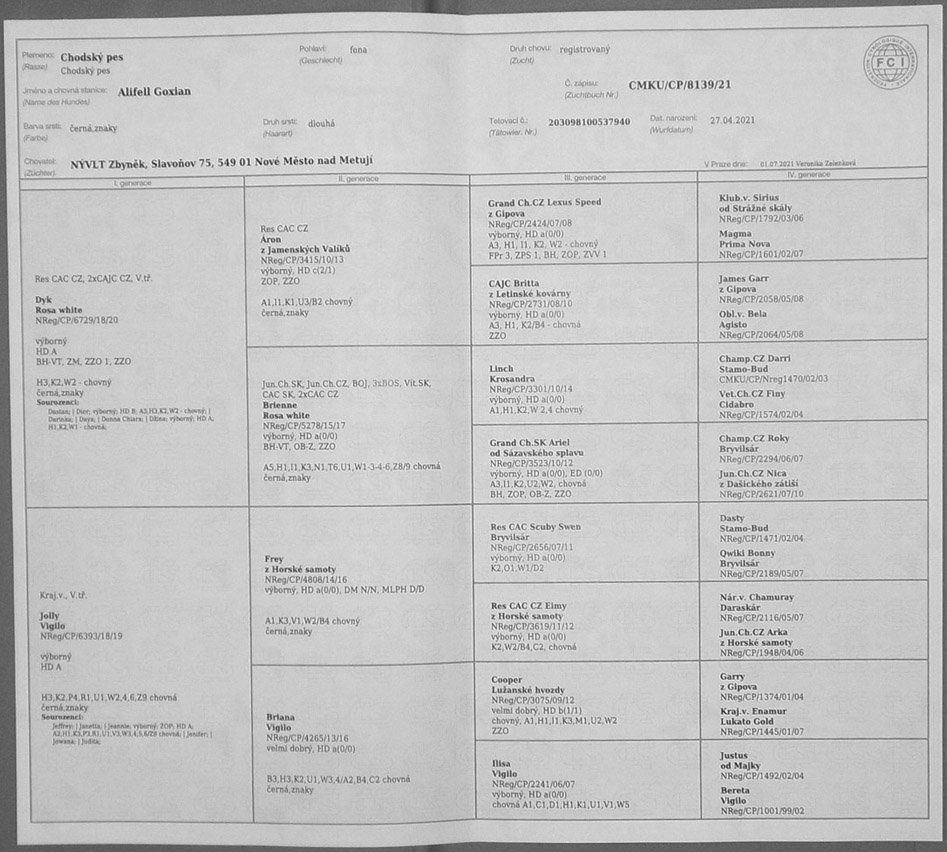 Alifell se narodila jako první štěně "vrhu A" chs Goxian dne 27. dubna 2021 v 5:33 hod. Označená byla žlutou stužkou. Již žije v Pardubickém kraji, kde jí čeká aktivní kariéra . . . pokračování