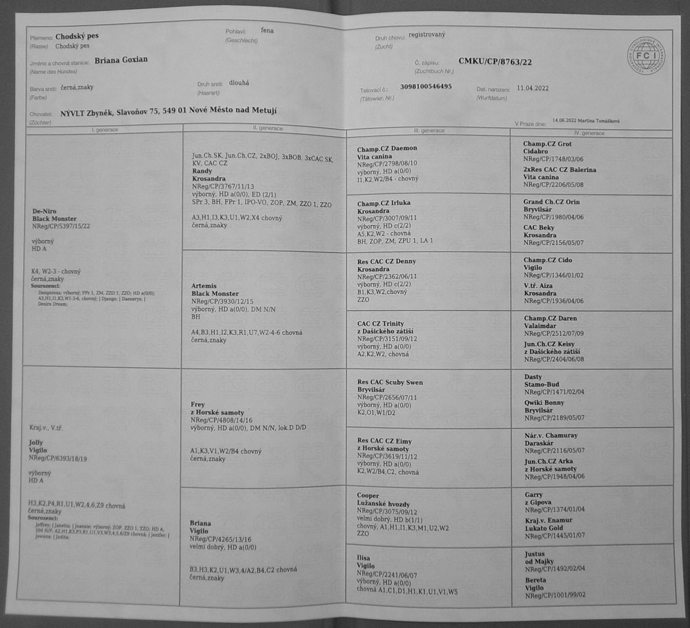 Briana se narodila jako šesté štěně "vrhu "B" chs Goxian dne 11. dubna 2022 ve 22:11 hod. Označená byla oranžovou stužkou. Již žije u nového majitele... pokračování