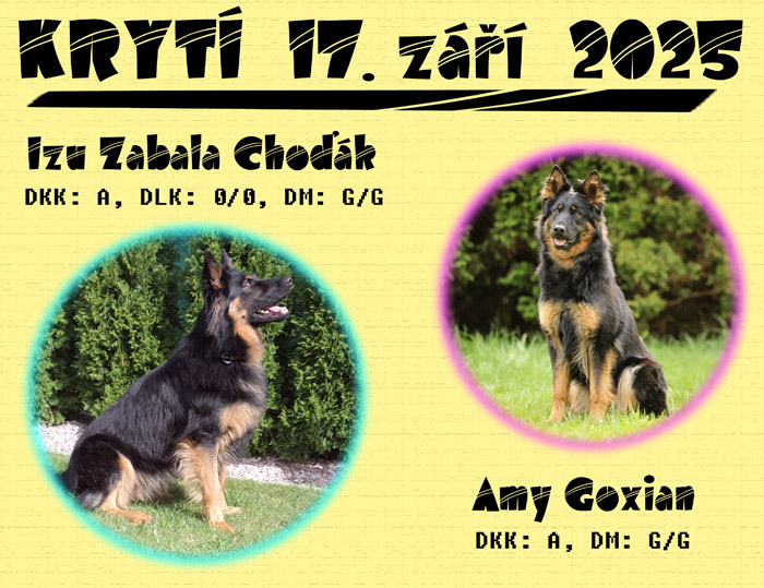 Krycím psem, a tedy otcem štěňátek se stal Izu Zabala Choďák. Je to charismatický pejsek se skvělými výsledky zdravotních vyšetření, a to RTG kloubů DKK: A, DLK: 0/0, dále DM: G/G, Lokus D: D/D, LTV: 1, L7 .